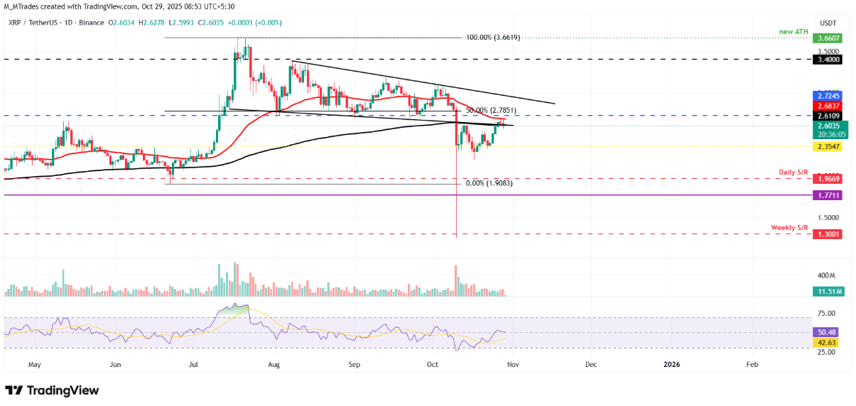 Giá XRP đã bị từ chối tại đường EMA 50 ngày quanh mốc 2,68 USD vào thứ Hai, sau đó giảm nhẹ trong phiên kế tiếp để kiểm tra lại đường EMA 200 ngày tại 2,61 USD. Tính đến tối thứ Tư, đồng coin này đang dao động ổn định quanh ngưỡng 2,60 USD.
