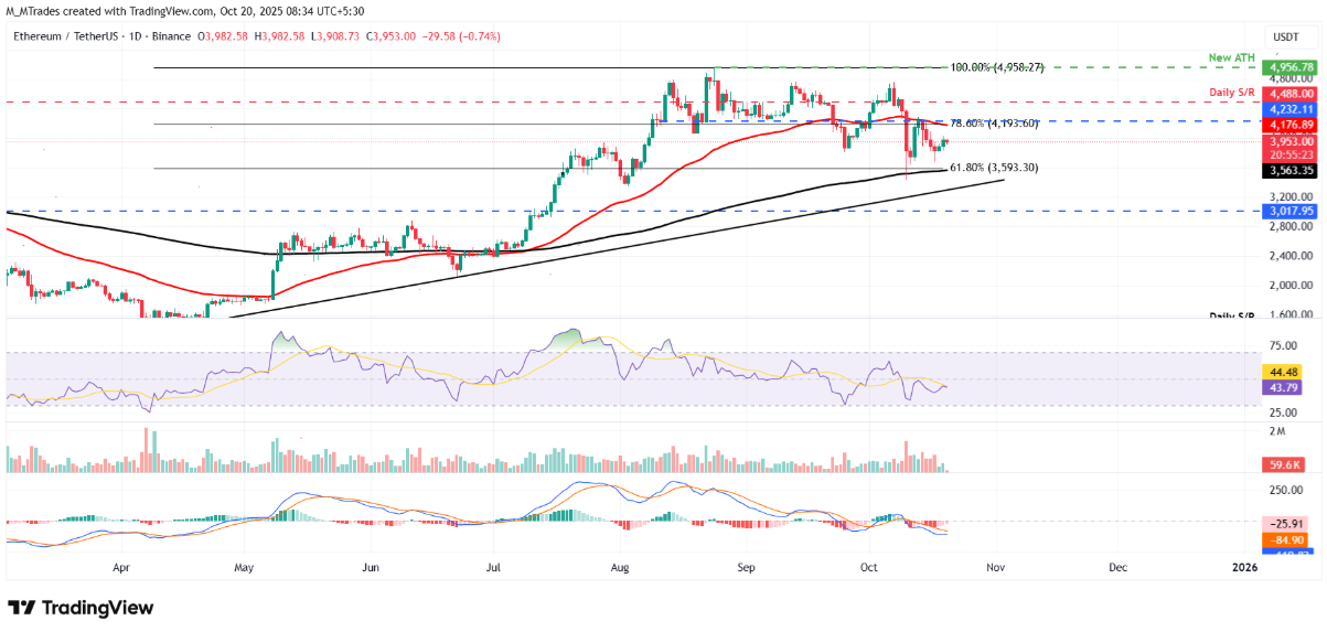 Giá Ethereum đã giảm hơn 4% trong tuần qua sau khi bị từ chối tại vùng kháng cự 4.232 USD. Bước sang đầu tuần này (thứ Hai), ETH đang dao động quanh mốc 3.953 USD, phản ánh tâm lý thận trọng của thị trường.