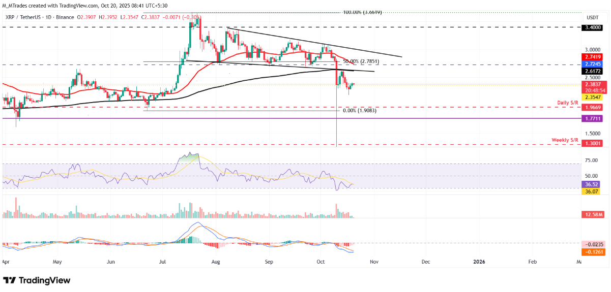 Giá XRP đã giảm hơn 5% trong tuần qua sau khi bị từ chối tại đường xu hướng dưới của mô hình cái nêm giảm. Tính đến thời điểm viết bài vào ngày thứ Hai, XRP đang dao động quanh mốc 2,38 USD.