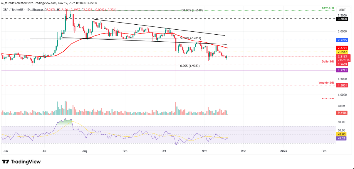 Giá XRP tuần trước bị từ chối mạnh tại đường EMA 50 ngày quanh 2,47 USD, kéo theo mức giảm gần 7%. Áp lực bán tiếp tục lan sang đầu tuần này, khi XRP điều chỉnh thêm vào thứ Hai trước khi hồi phục nhẹ trong phiên tiếp theo. Đến trưa thứ Tư, token đang dao động quanh mốc 2,21 USD.