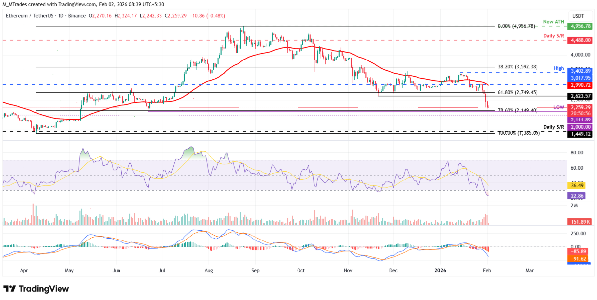 Giá Ethereum đã chốt phiên thứ Sáu dưới ngưỡng Fibonacci thoái lui 61,8% tại 2.749 USD, mở ra nhịp điều chỉnh mạnh khi đồng coin này lao dốc hơn 16% chỉ trong hai ngày kế tiếp. Đến thứ Hai, ETH tiếp tục chịu áp lực bán và đang giao dịch dưới mốc 2.259 USD.
