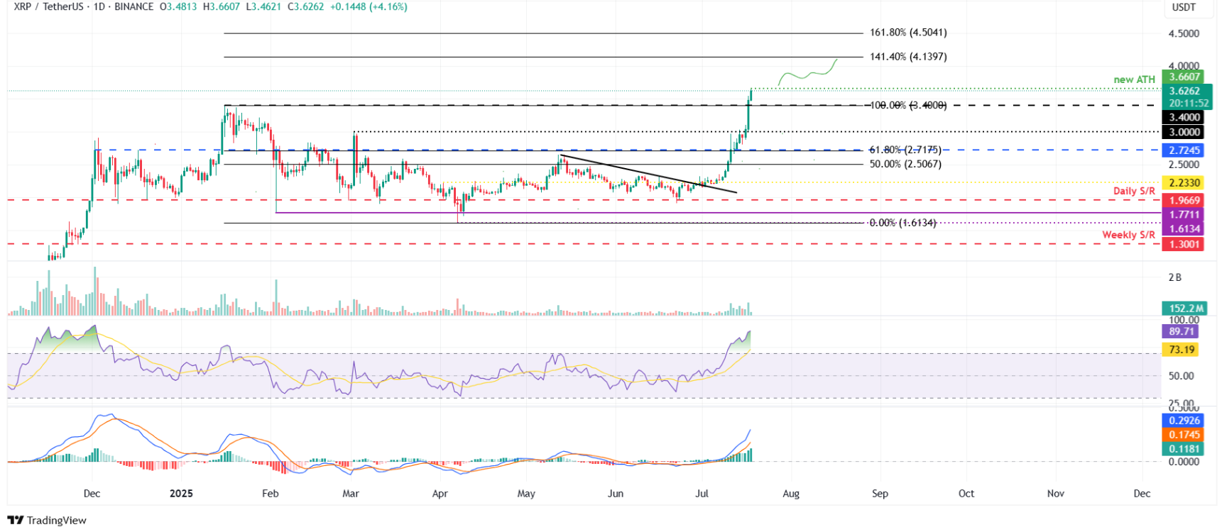 Giá XRP đã bứt phá mạnh mẽ, vượt qua ngưỡng tâm lý quan trọng $3 vào thứ Tư và tiếp tục tăng thêm 14,60% trong phiên giao dịch kế tiếp. Đến thời điểm sáng thứ Sáu, đà tăng chưa có dấu hiệu chững lại khi XRP thiết lập mức đỉnh lịch sử mới tại $3,66.