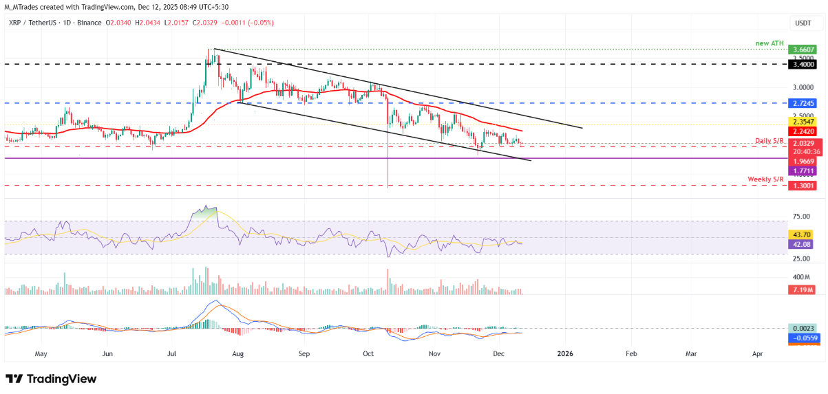 Giá XRP đã bật lên từ vùng hỗ trợ 1,96 USD vào Chủ nhật, ghi nhận mức tăng 3,66% trong hai ngày tiếp theo. Tuy nhiên, đến thứ Tư, lực bán quay trở lại khiến XRP điều chỉnh mạnh, xóa gần hết mức tăng trước đó và một lần nữa lùi về kiểm tra ngưỡng 1,96 USD trong phiên kế tiếp. Tính đến thứ Sáu, giá đang dao động quanh mốc 2,03 USD, phản ánh tâm lý thận trọng của thị trường.