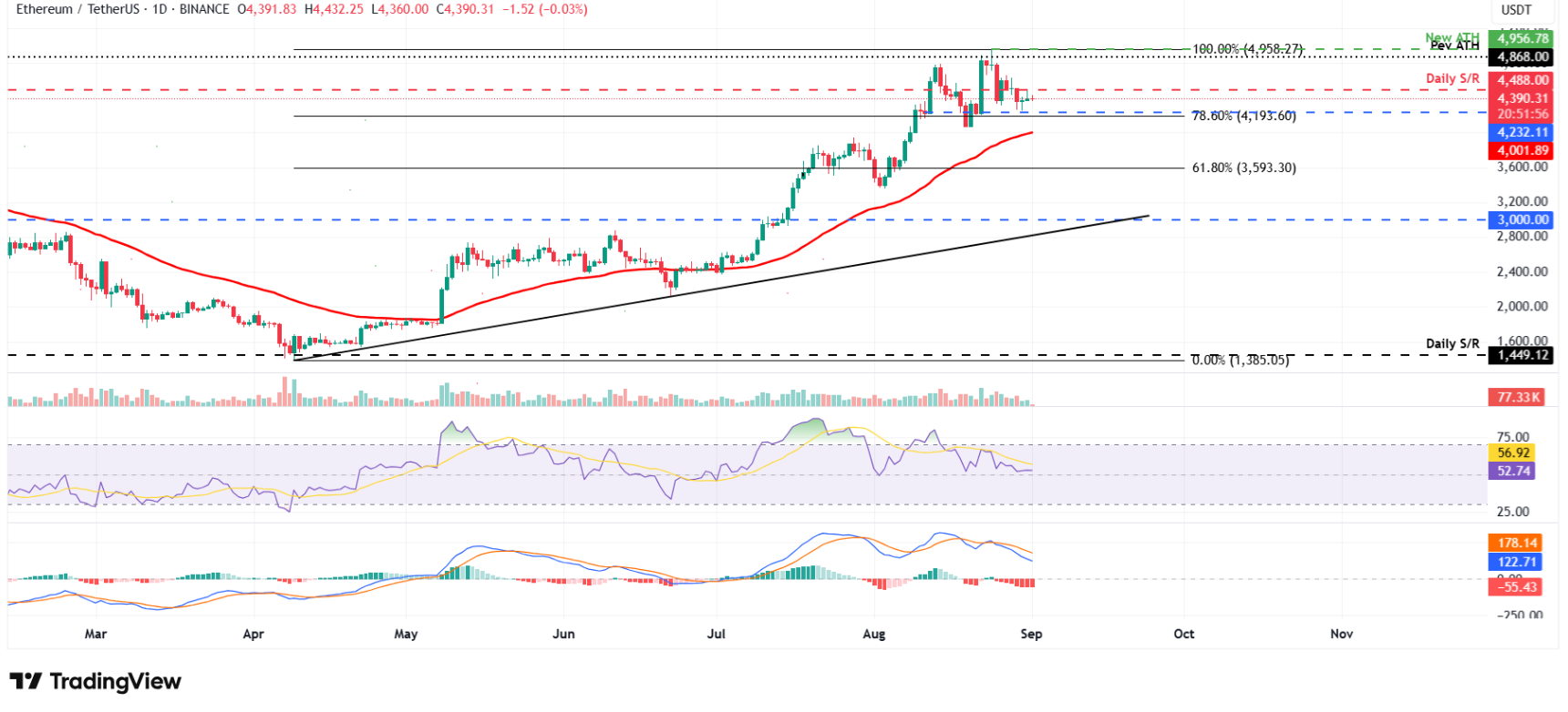 Ethereum (ETH) đã thiết lập kỷ lục mới ở mức 4.956 USD vào ngày 24/8, nhưng đà tăng nhanh chóng suy yếu khi giá lao dốc hơn 9% tính đến cuối tuần. Dù vậy, ETH đã kịp kiểm tra và giữ vững vùng hỗ trợ quan trọng tại 4.232 USD vào thứ Bảy, trước khi bật nhẹ trở lại trong phiên Chủ nhật. Đến sáng thứ Hai, đồng coin này đang dao động quanh ngưỡng 4.390 USD.