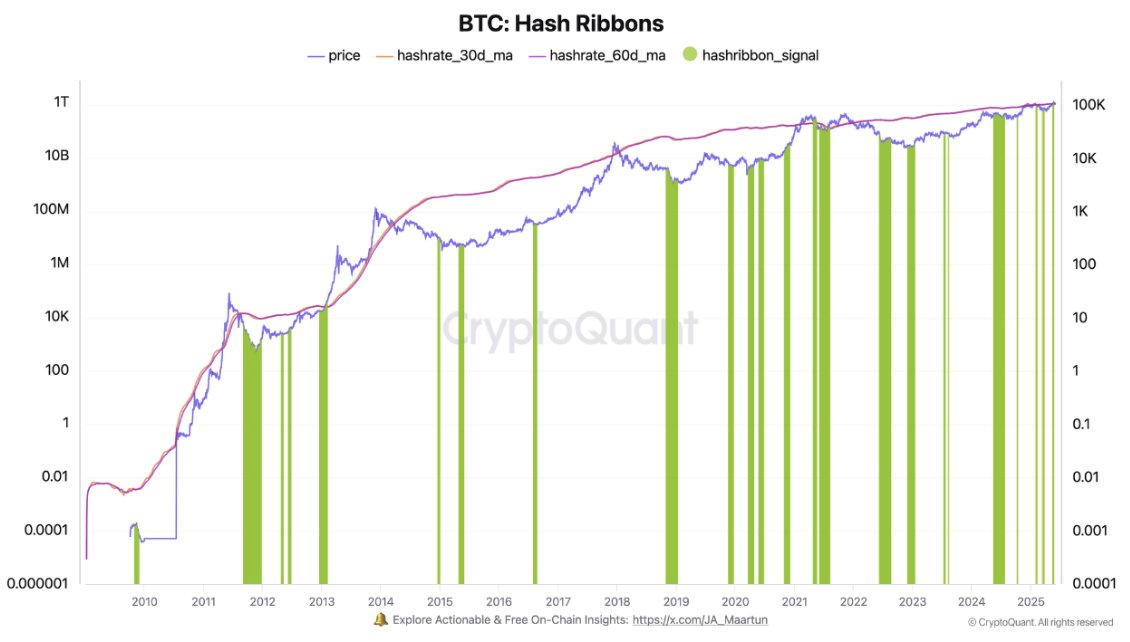 Nhưng không phải tất cả các chỉ số đều hướng lên. Theo CryptoQuant, chỉ số Hash Ribbons, theo dõi mức độ căng thẳng của thợ đào, gần đây đã phát ra tín hiệu mua.