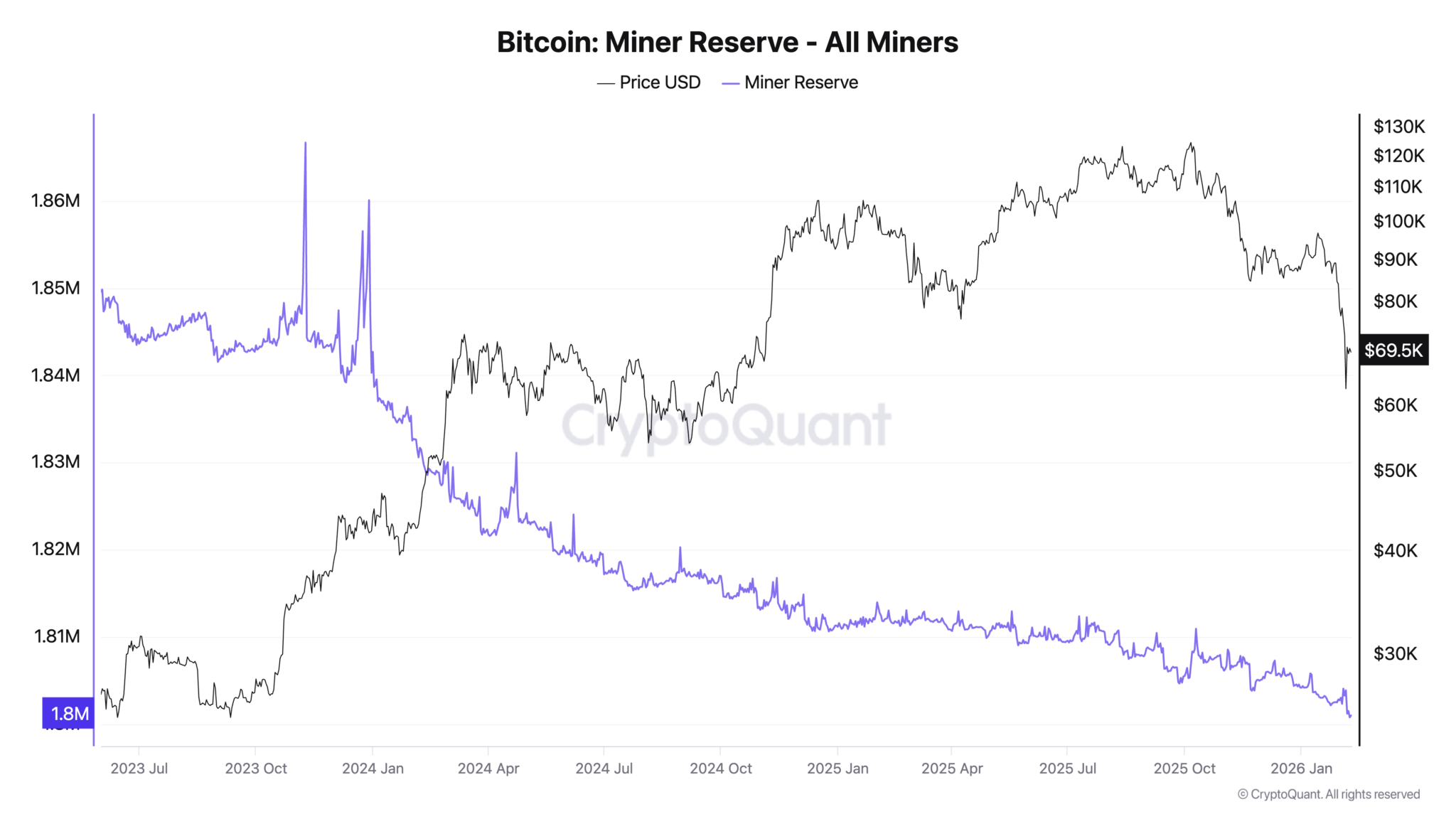 Xu hướng dài hạn cũng cho thấy dự trữ thợ đào giảm dần qua nhiều năm, ngay cả khi giá tăng theo thời gian, phản ánh nguồn cung do thợ đào nắm giữ đang bị bào mòn mang tính cấu trúc.