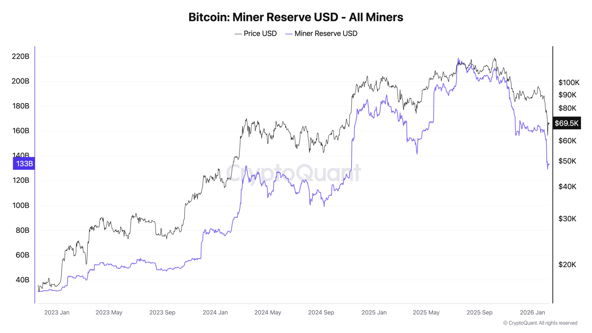 Nếu tính theo USD, bức tranh còn rõ rệt hơn. Giá trị dự trữ thợ đào hiện quanh 133 tỷ USD, giảm hơn 20% chỉ trong khoảng hai tháng. Một phần do giá giảm, một phần do coin rời ví thợ đào. Sự kết hợp này làm thu hẹp “vùng đệm an toàn” của họ.