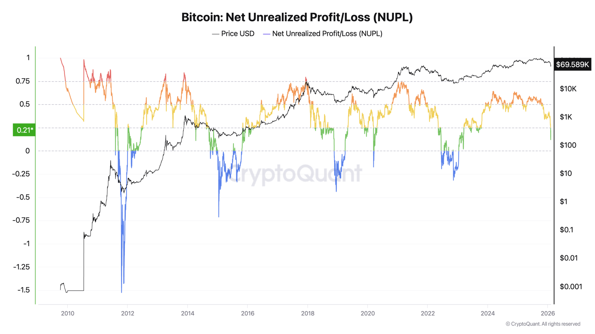Để xác định vị trí trong chu kỳ, cần biết thị trường đang ở một nhịp điều chỉnh thông thường hay tiến gần một đợt “rửa trôi” sâu hơn. NUPL (lãi/lỗ chưa thực hiện ròng) giúp nhìn tổng thể thị trường đang ngồi trên lợi nhuận, thua lỗ hay ở giữa.