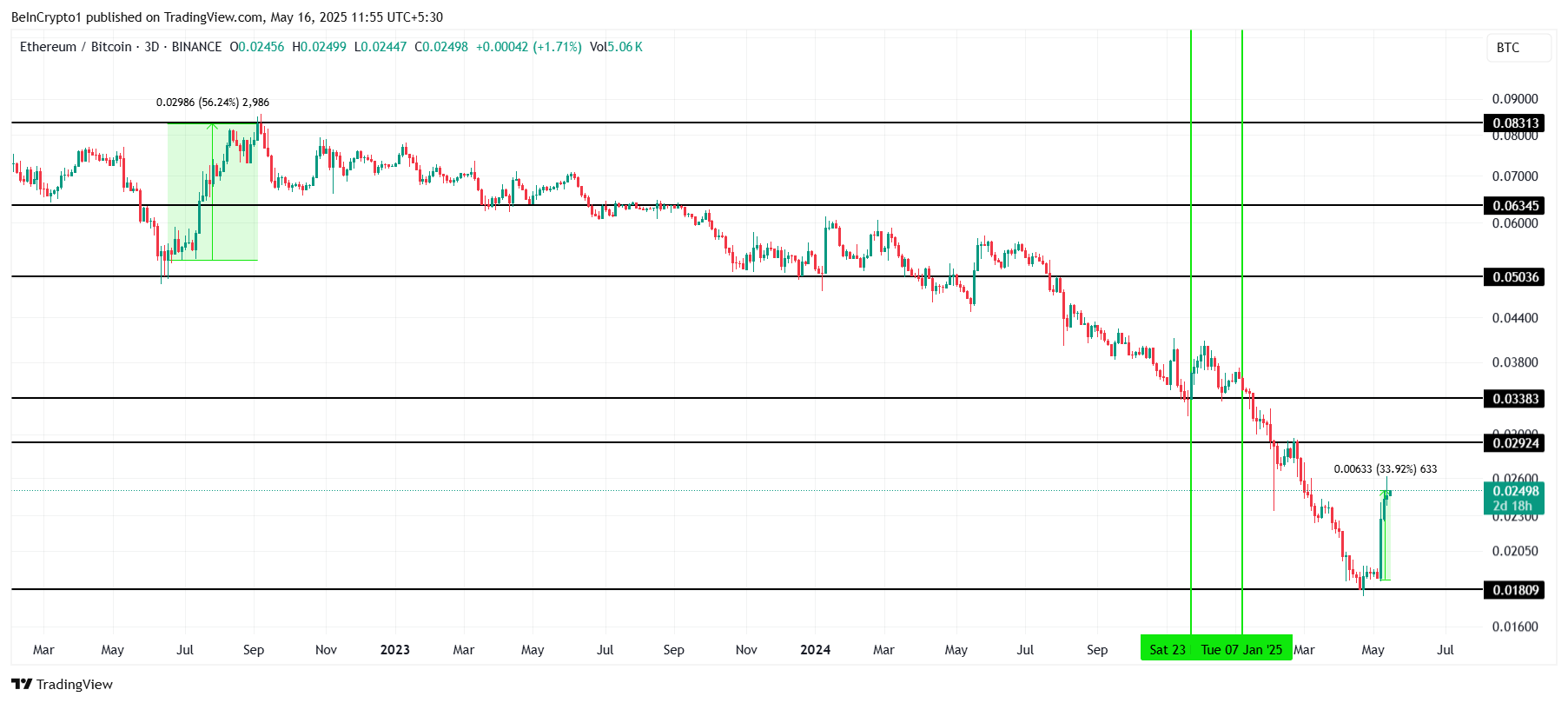 Cặp ETH/BTC vừa ghi nhận breakout đầu tiên kể từ tháng 12 năm 2024. Lần đầu tiên sau 5 tháng, cặp này đã tạo ra đáy cao hơn – thường được coi là dấu hiệu của xu hướng tăng. Breakout rất đáng chú ý, đánh dấu mức tăng 34% chỉ trong một tuần.