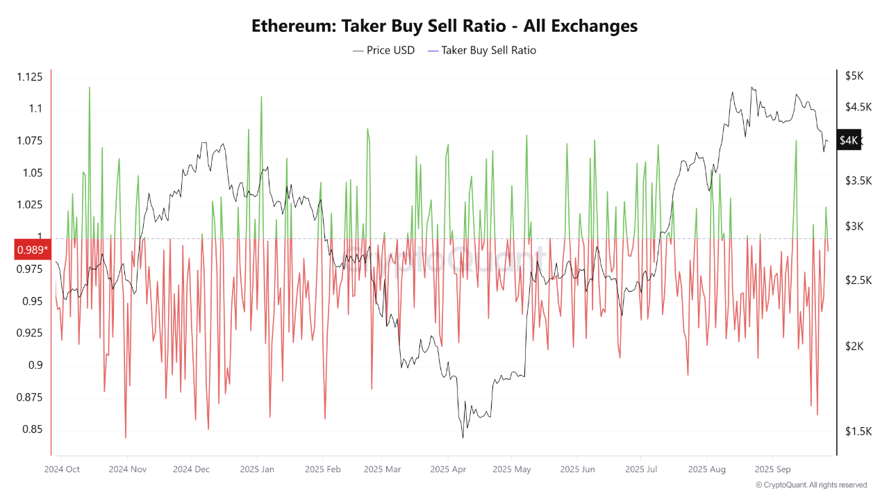 Đồng thời, Tỷ lệ Mua/Bán của Người chấp nhận (Taker Buy/Sell Ratio) đang dao động ngay dưới mức 1.0, phản ánh áp lực bán liên tục từ những người chấp nhận (taker) giao dịch tích cực. Tuy nhiên, lịch sử cho thấy rằng khi chỉ số này chạm đáy và đảo chiều, Ethereum thường tạo ra các đợt phục hồi mạnh mẽ.