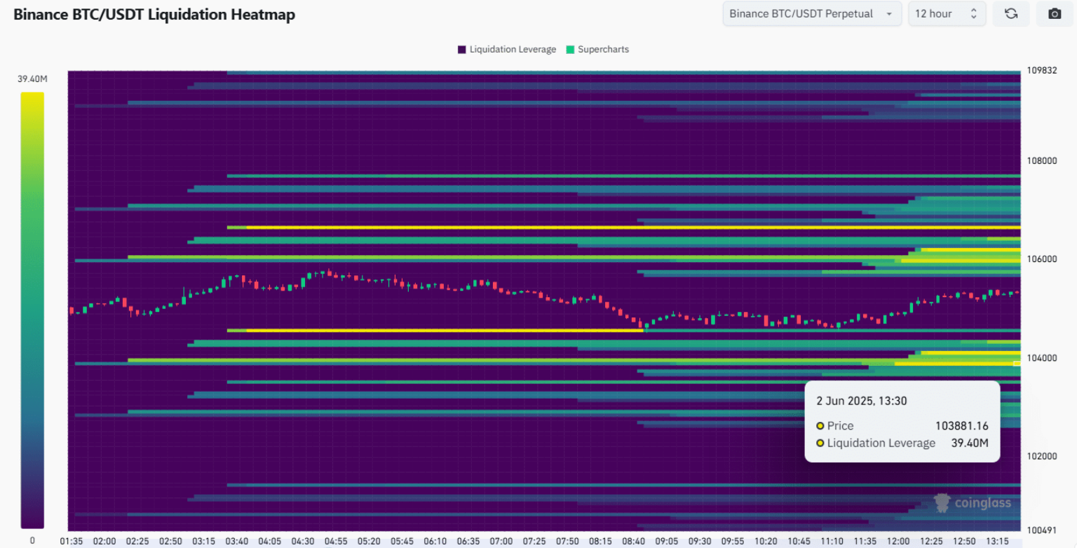 Tuy nhiên, không thể phủ nhận áp lực từ nhóm lệnh Long đang ngày càng dồn nén mạnh mẽ. Một khối lượng Long lớn đã được thiết lập, với điểm kích hoạt thanh lý nằm ở mốc $103.881. Nếu Bitcoin trượt về mức giá này, gần 39,4 triệu USD giá trị các lệnh Long sẽ ngay lập tức bị xóa sổ.