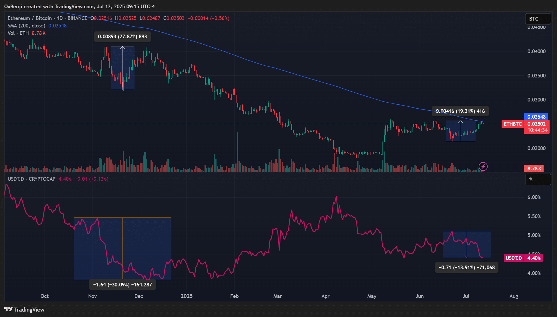 Nếu ETH/BTC có thể vượt qua mức SMA 200 ngày một cách bền vững, điều này sẽ càng xác nhận sự luân chuyển vốn mạnh mẽ từ BTC sang các altcoin và thúc đẩy thị trường altcoin phát triển mạnh mẽ hơn. Ngược lại, nếu tỷ lệ này giảm, có thể sẽ hạn chế đà phục hồi của thị trường altcoin.