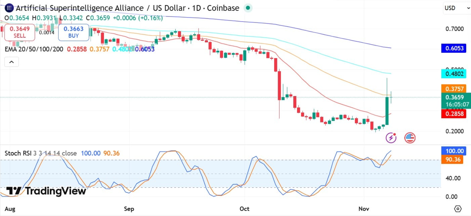 Tại thời điểm viết bài, FET đang được giao dịch quanh mức 0,36 USD, tăng 40,7% trong 24 giờ qua, phản ánh rõ rệt ưu thế vượt trội của phe bò trên thị trường.