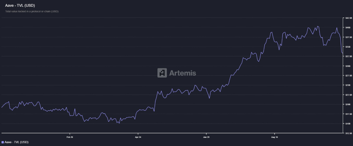 Theo dữ liệu từ Arthemis Terminal, tổng giá trị bị khóa (TVL) của Aave đã giảm mạnh từ 39,9 tỷ USD (ngày 7/10) xuống còn 33,2 tỷ USD vào thứ Hai, đánh dấu mức thấp nhất kể từ giữa tháng 8. Đà sụt giảm này cho thấy hoạt động trong hệ sinh thái Aave đang chậm lại rõ rệt, khi số lượng người gửi tài sản hoặc sử dụng các giao thức dựa trên AAVE ngày càng thu hẹp — phản ánh xu hướng quan tâm suy yếu của thị trường.
