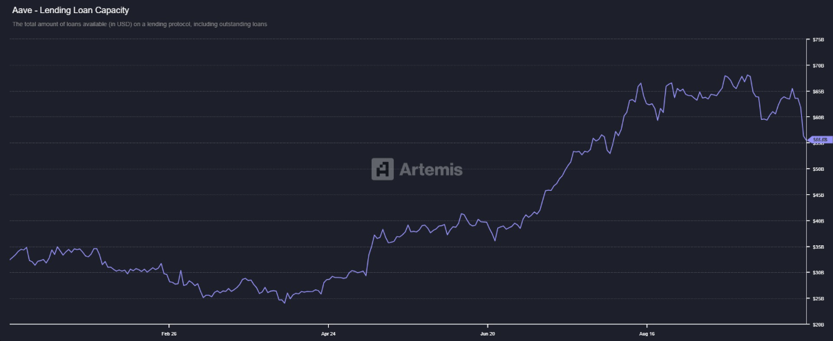 Song song đó, năng lực cho vay (lending loan capacity) của AAVE cũng lao dốc từ 65,6 tỷ USD xuống còn 55,5 tỷ USD trong cùng giai đoạn, mức thấp tương tự kể từ giữa tháng 8. Sự sụt giảm này cho thấy thanh khoản trên nền tảng đang co hẹp, đồng thời phản ánh niềm tin và mức độ tham gia của người dùng đối với giao thức đang suy giảm.