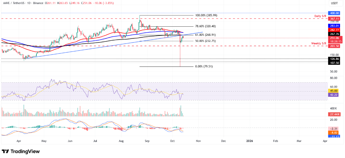 Nếu nhịp điều chỉnh tiếp tục, AAVE có thể lùi sâu hơn về vùng hỗ trợ tuần quanh 203,50 USD. Trên khung ngày, RSI hiện ở mức 42 – thấp hơn ngưỡng trung tính 50, phản ánh việc phe gấu vẫn chiếm ưu thế. Cùng lúc đó, MACD cũng vừa ghi nhận giao cắt giảm (bearish cross) vào thứ Sáu, củng cố thêm triển vọng tiêu cực cho đồng coin này.