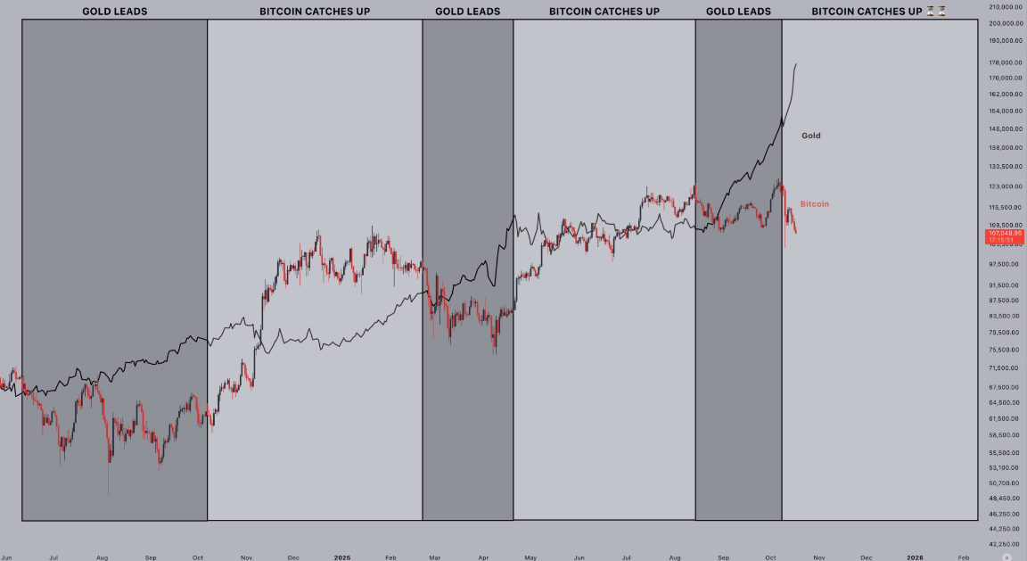 Tuy vậy, một số nhà phân tích khác lại cho rằng dòng vốn có thể sớm quay trở lại với Bitcoin. “Dù thế nào, việc nhà đầu tư chốt lời và rút khỏi vàng là điều dễ hiểu trong bối cảnh thị trường hiện nay,” nhà phân tích tiền điện tử Jelle chia sẻ trên X, đồng thời đăng kèm biểu đồ cho thấy những giai đoạn Bitcoin từng dẫn dắt, rồi bắt kịp đà tăng của vàng qua từng năm.