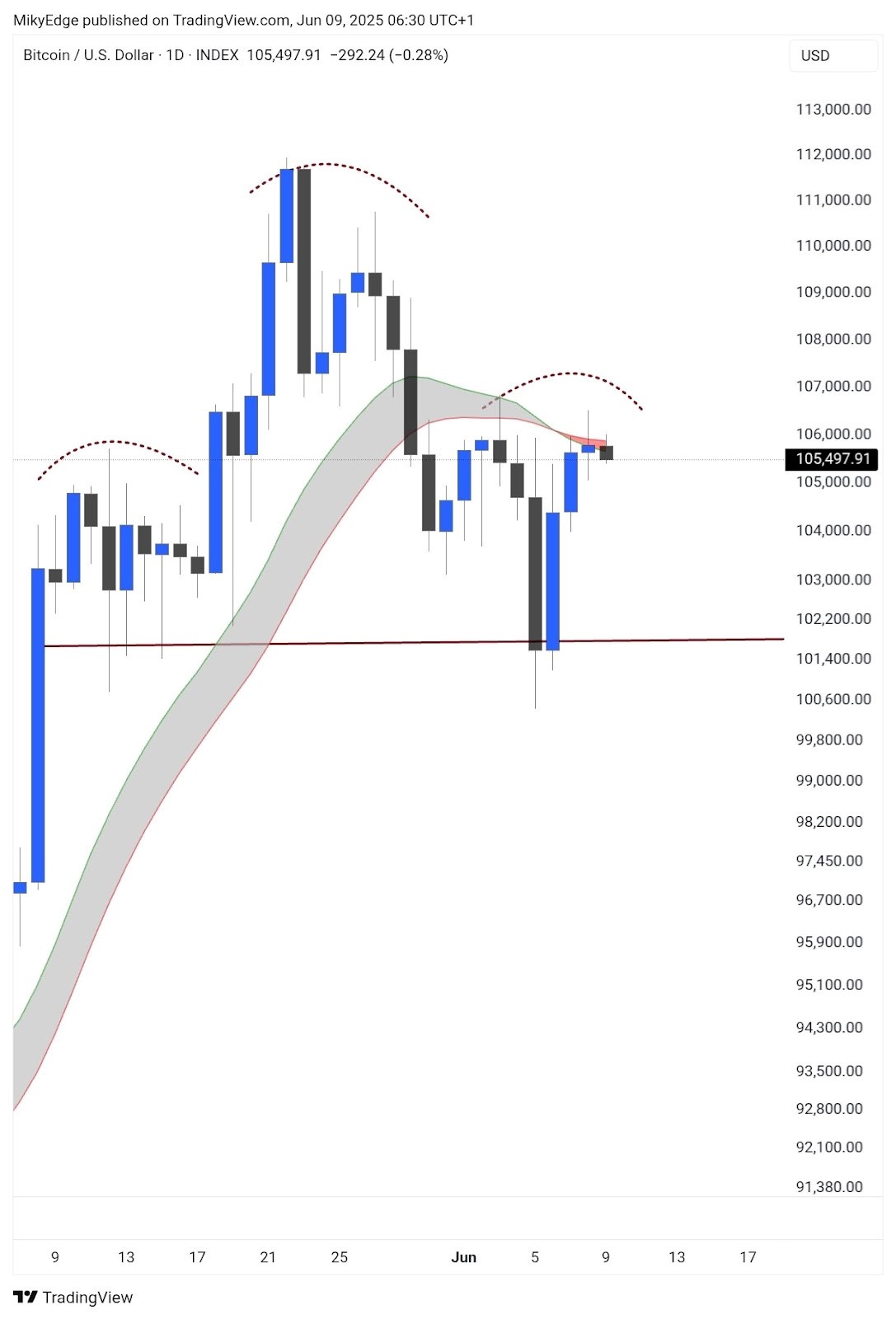 Trader Daan Crypto Trades chia sẻ trong một bài đăng ngày 8/6 trên X rằng Bitcoin vẫn duy trì đà tăng kể từ khi vượt lên lại trên dải hỗ trợ thị trường tăng giá, đồng thời nhấn mạnh: