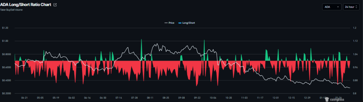 Không chỉ vậy, dữ liệu từ CoinGlass cho thấy tỷ lệ long/short của ADA trong ngày thứ Năm chỉ đạt 0,95. Việc chỉ số này thấp hơn ngưỡng 1 phản ánh tâm lý bi quan đang bao trùm thị trường, khi số lượng nhà giao dịch đặt cược vào kịch bản giá giảm đang chiếm ưu thế so với phe kỳ vọng tăng giá.