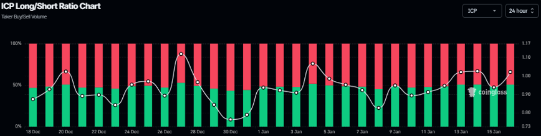 Song song với đó, tỷ lệ Long/Short của ICP đạt 1,02 vào ngày thứ Sáu. Việc tỷ lệ này vượt ngưỡng 1 cho thấy tâm lý thị trường đang nghiêng về phía lạc quan, khi phần lớn trader tin tưởng và đặt cược vào khả năng giá ICP sẽ tiếp tục đi lên trong thời gian tới.