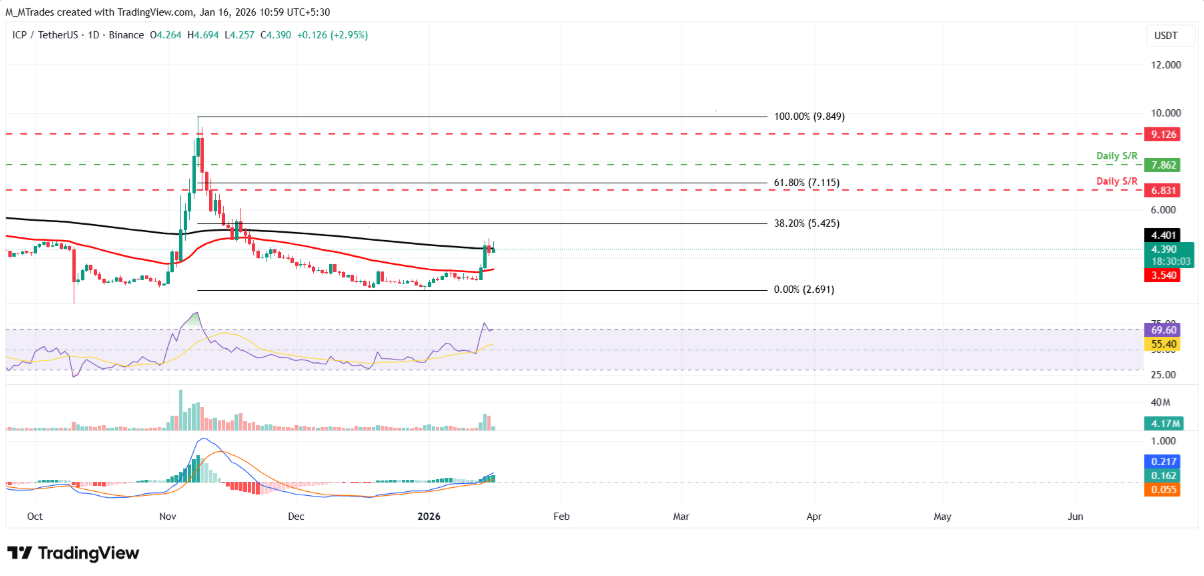 Internet Computer (ICP) đang giao dịch vững chắc trên ngưỡng 4,30 USD trong phiên thứ Sáu, ghi nhận mức tăng ấn tượng hơn 40% kể từ đầu tuần. Động lực tăng giá không chỉ đến từ tâm lý thị trường tích cực mà còn được hậu thuẫn bởi các chỉ số on-chain và dữ liệu phái sinh cho thấy sự cải thiện rõ rệt. Trên phương diện kỹ thuật, nhiều tín hiệu đang nghiêng về kịch bản xu hướng tăng tiếp diễn, trong đó phe bò được kỳ vọng sẽ hướng tới các vùng giá cao hơn, vượt mốc 5 USD trong thời gian tới.