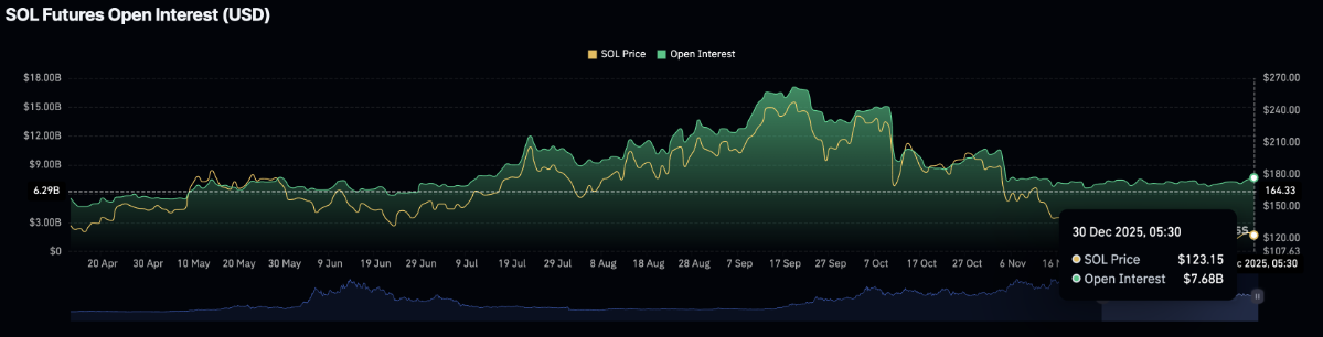 Trên thị trường phái sinh, tâm lý của nhà đầu tư cá nhân đang có dấu hiệu nghiêng về phe bán. Dữ liệu từ CoinGlass cho thấy hợp đồng mở (OI) của hợp đồng tương lai SOL — đại diện cho tổng giá trị danh nghĩa của các vị thế đang mở — đã tăng lên 7,68 tỷ USD vào thứ Hai, so với 7,54 tỷ USD của ngày trước đó. Điều này phản ánh việc dòng vốn mới tiếp tục được bơm vào thị trường phái sinh của Solana.
