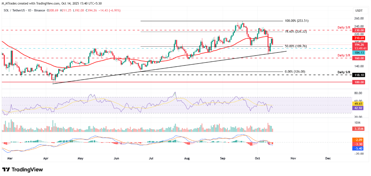 Nếu đà giảm tiếp tục, giá SOL có thể tiếp tục hạ xuống để thử thách mức hỗ trợ hàng ngày kế tiếp tại 184,13 USD. Chỉ báo RSI trên khung ngày hiện ở mức 42, thấp hơn mốc trung lập 50 và đang hướng xuống, báo hiệu động lực giảm đang chiếm ưu thế. Đồng thời, MACD đã hình thành tín hiệu bearish cross từ thứ Sáu và duy trì cho đến nay, càng củng cố nhận định xu hướng giảm.