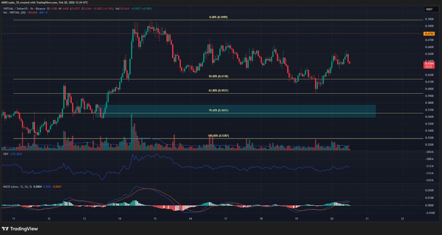 Quan sát trên biểu đồ khung 1 ngày cho thấy xu hướng dài hạn cũng như cấu trúc dao động của VIRTUAL vẫn nghiêng về giảm giá. Sau nhịp tăng hồi đầu tháng 1, thị trường nhanh chóng đảo chiều, cho thấy altcoin này chưa sẵn sàng xác lập một xu hướng tăng mới.