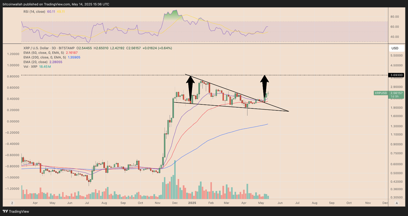 XRP đang cho thấy dấu hiệu thoát khỏi mô hình tam giác đối xứng hình thành trên biểu đồ 2 tuần kể từ đầu năm 2025, điều này có thể dẫn đến xu hướng tiếp tục tăng giá rộng hơn trong những tháng tới.