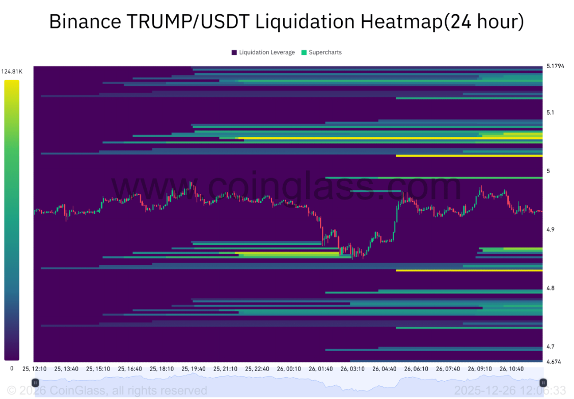Bản đồ nhiệt thanh lý trong 24 giờ qua cho thấy các cụm thanh lý dày đặc đang tập trung phía trên vùng giá hiện tại, chủ yếu quanh khu vực 5,10–5,20 USD, trong khi thanh khoản phía dưới mỏng hơn, đáng chú ý tại vùng 4,80 USD.