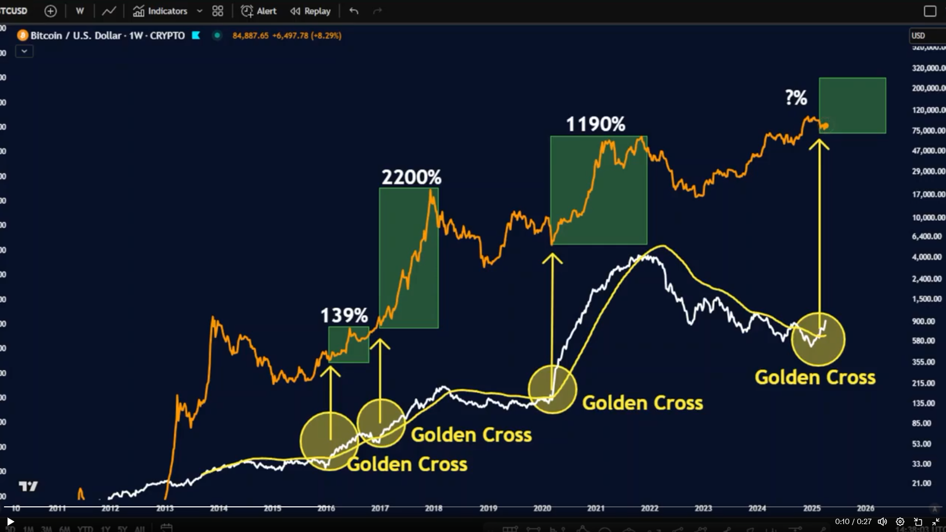 Golden cross của Bitcoin, được hình thành khi đường trung bình động đơn giản 50 ngày (SMA 50) cắt lên trên đường SMA 200 ngày, thường mở ra những đợt tăng giá mạnh mẽ.