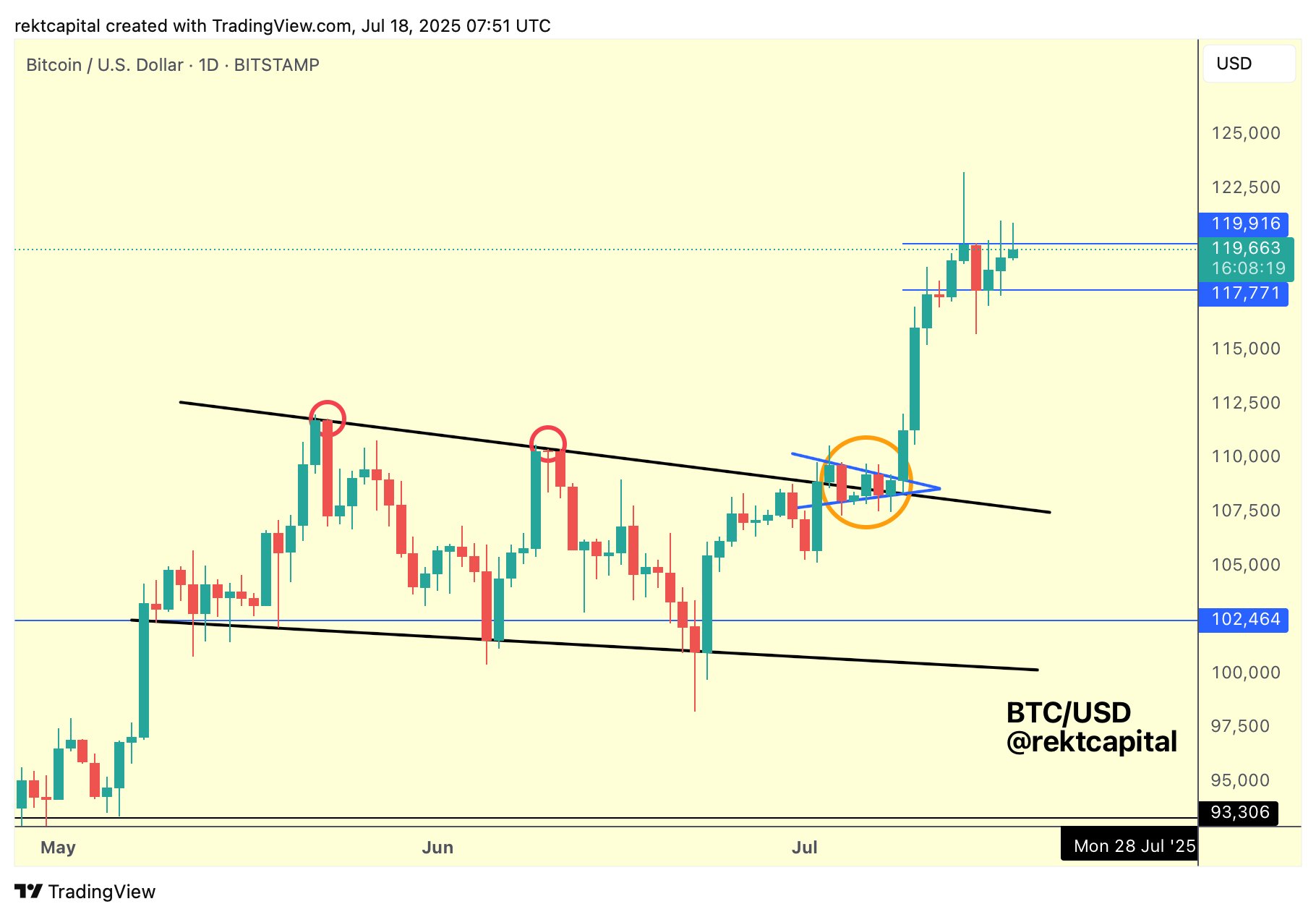 “Việc đóng nến ngày trên vùng kháng cự đỉnh phạm vi ở khoảng 120.000 USD, sau đó là một cú retest hậu đột phá, sẽ xác nhận cú bứt phá của Bitcoin lên mức đỉnh mới”, nhà phân tích Rekt Capital nhận định.