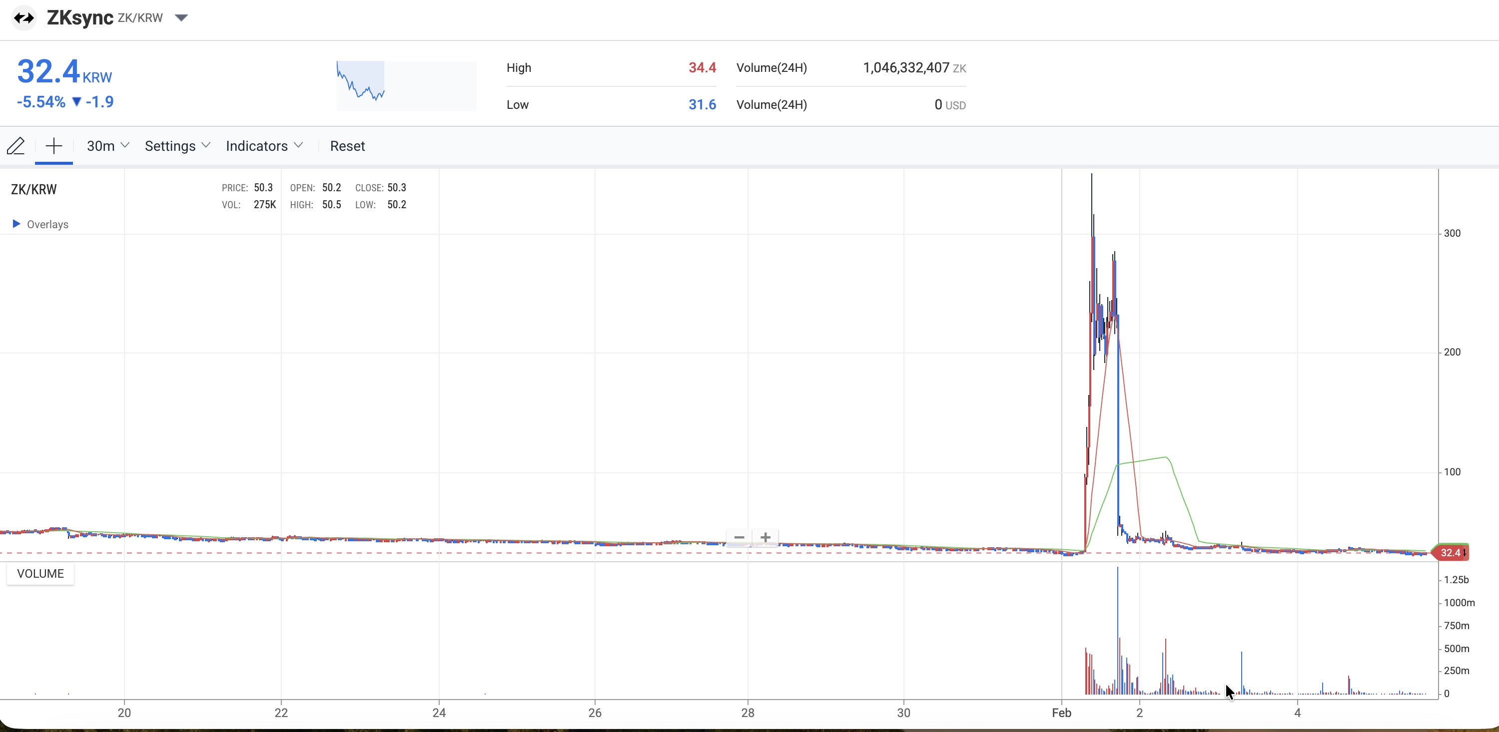 ZKsync được giao dịch quanh mức 30 KRW vào sáng Chủ nhật, trước thời điểm sàn Upbit tiến hành bảo trì hệ thống theo lịch. Đến 11h30 trưa, ngay trước khi quá trình bảo trì bắt đầu, giá token này tăng mạnh lên 300 KRW, sau đó lại giảm sâu về khoảng 30 KRW vào lúc 18h30 cùng ngày — thời điểm bảo trì kết thúc.