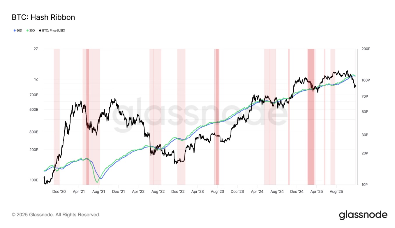 Hash Ribbon đã chứng tỏ là một chỉ báo đáng tin cậy cho các đáy chu kỳ của Bitcoin. Tín hiệu mới nhất xuất hiện sau khi giá Bitcoin giảm 35% từ đỉnh kỷ lục tháng 10, từ $123.000 xuống còn $81.000 vào ngày 21/11, trước khi hồi phục trở lại quanh mức $90.000.