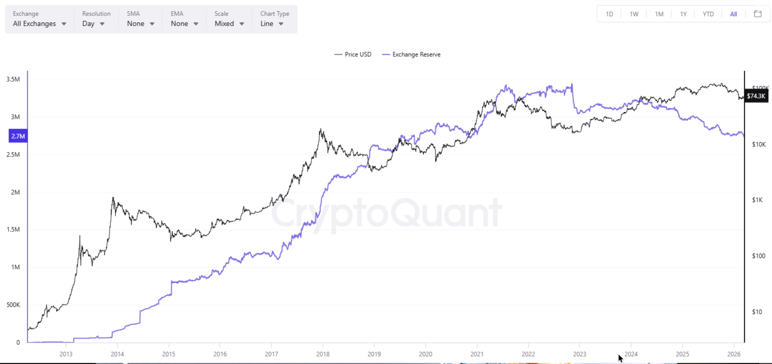 Ngoài ra, Martinez cho biết hơn 33.000 BTC đã được rút khỏi các sàn giao dịch trong tuần qua. Dữ liệu từ CryptoQuant cho thấy lượng Bitcoin lưu trữ trên các sàn gần đây đã giảm xuống mức thấp nhất trong sáu năm, khoảng 2,73 triệu BTC. Đây thường được xem là tín hiệu tích cực vì làm giảm áp lực bán ngay trên thị trường.