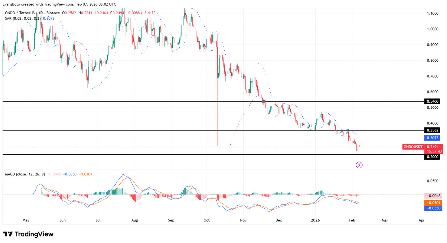 Đáng chú ý, các chỉ báo động lượng của ONDO tiếp tục phản ánh trạng thái suy yếu, củng cố quan điểm rằng giá hiện chưa đủ lực để duy trì những nhịp hồi mang tính bền vững.