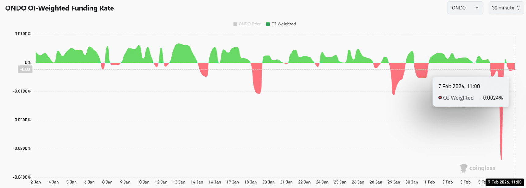 Tỷ lệ funding rate đã chuyển sang vùng âm, qua đó xác nhận sự dịch chuyển rõ rệt của quyền kiểm soát sang phe gấu trên thị trường phái sinh ONDO.