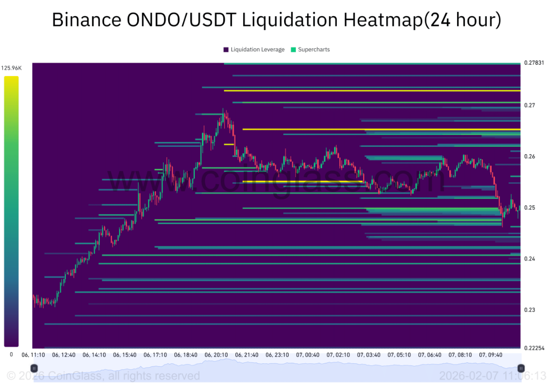 Cuối cùng, bản đồ nhiệt thanh lý đang phơi bày rõ ranh giới rủi ro ngắn hạn của ONDO, khi các cụm đòn bẩy dày đặc hình thành những “điểm nghẽn” thanh khoản then chốt. Lượng vị thế short sử dụng đòn bẩy lớn tập trung dày phía trên vùng 0,27 USD, cho thấy đây là vùng nhạy cảm nếu giá xuất hiện nhịp hồi mạnh.