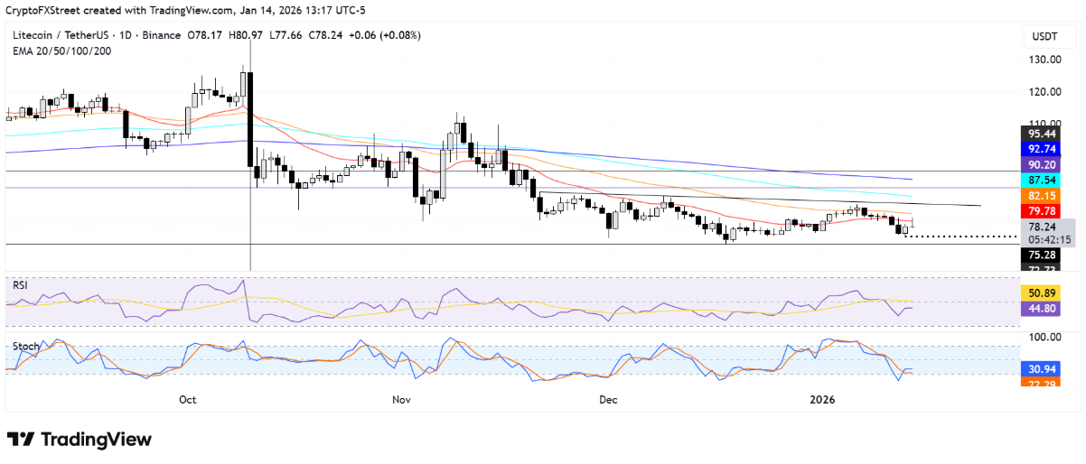 Vào phiên giao dịch thứ Năm, Litecoin vẫn loay hoay tìm điểm bứt phá khi liên tục bị kìm hãm dưới hai đường trung bình động hàm mũ (EMA) 20 ngày và EMA 50 ngày, dù trước đó đã bật lên thành công từ vùng hỗ trợ 75 USD. Trong kịch bản tích cực, nếu lực mua đủ mạnh giúp giá vượt qua cụm EMA này, LTC nhiều khả năng sẽ tiến tới kiểm tra đường xu hướng giảm hình thành từ tháng 11 – khu vực hiện đang đóng vai trò kháng cự đáng chú ý.