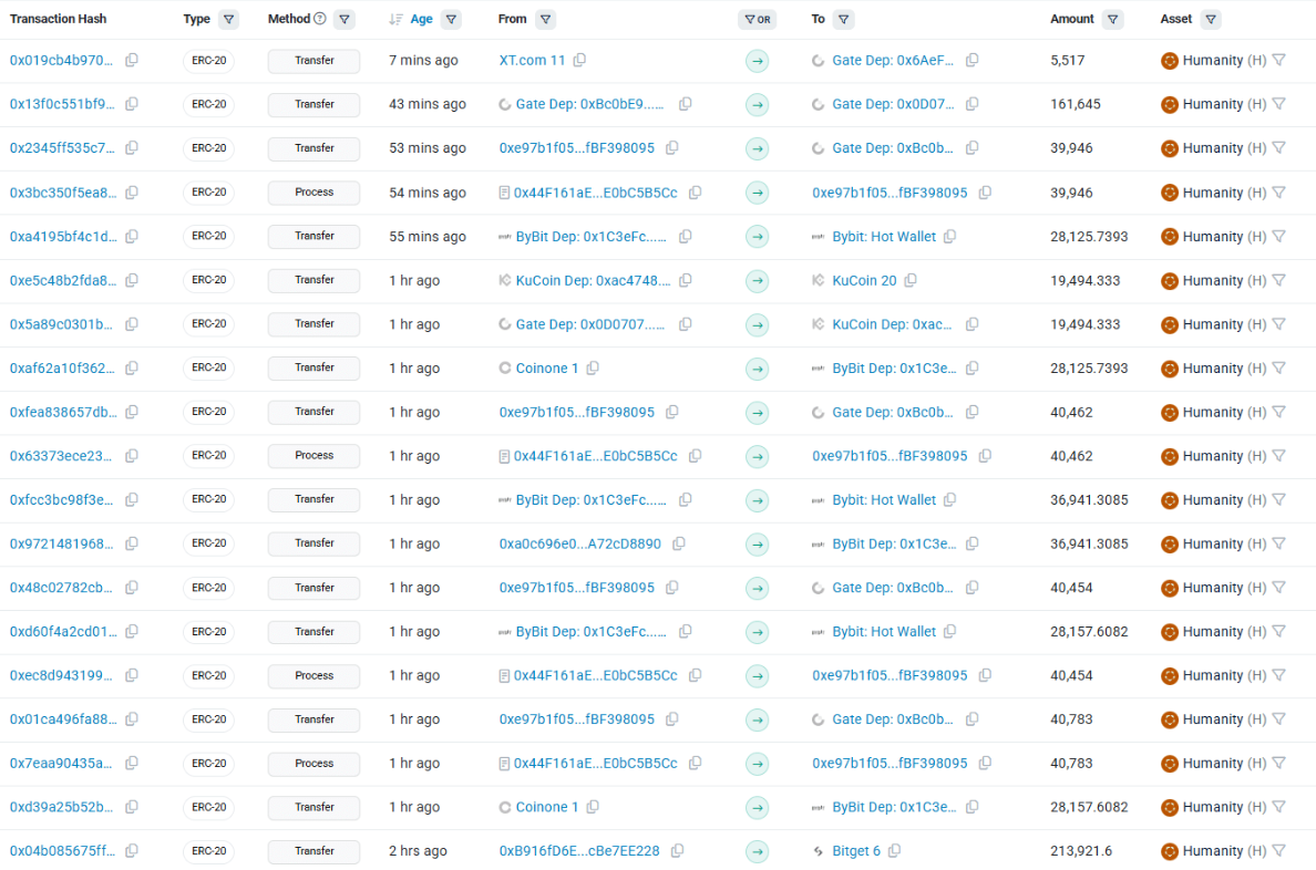 Dữ liệu từ Etherscan cho thấy các holder đang gia tăng chuyển token lên nhiều sàn giao dịch lớn như Bybit, KuCoin và Gate.io. Đáng chú ý, giao dịch có quy mô lớn nhất và diễn ra gần đây nhất ghi nhận 161.645 H được nạp trực tiếp vào ví của Gate.io.