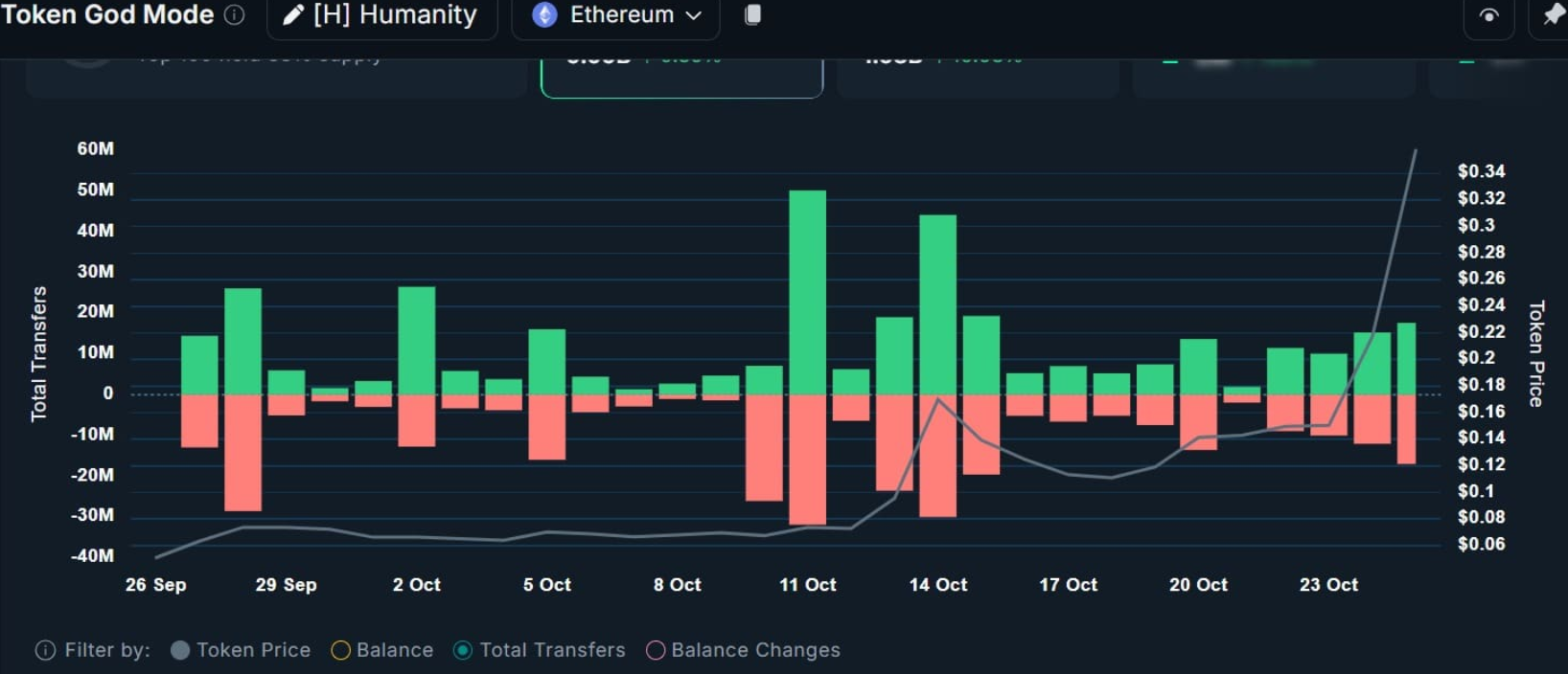 Dữ liệu từ Nansen cho thấy các “cá voi” đã không ngừng gia tăng vị thế kể từ ngày 22/10. Chỉ trong 24 giờ qua, nhóm này đã mua ròng 3,9 triệu token, nâng tổng lượng mua tích lũy lên 54 triệu token — một tín hiệu rõ ràng cho thấy dòng tiền lớn đang mạnh mẽ chảy vào Humanity.