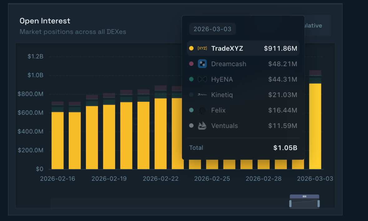 Động lực quan trọng đến từ Giao thức Cải tiến Hyperliquid 3 (HIP-3), cho phép người dùng triển khai hợp đồng tương lai với mức ký quỹ 500.000 token HYPE. Theo dữ liệu từ Flowscan, tổng giá trị hợp đồng mở (OI) trên HIP-3 đạt 1,05 tỷ USD tính đến thứ Ba, sau khi từng leo lên đỉnh 1,13 tỷ USD vào thứ Bảy — phản ánh hoạt động giao dịch sôi động giữa bối cảnh biến động địa chính trị.