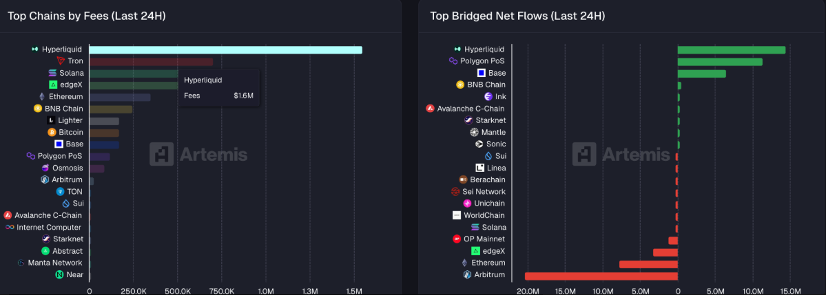 Song song đó, dòng tiền ròng duy trì ổn định cùng mức phí giao dịch dẫn đầu thị trường cho thấy sức hút ngày càng lớn của Hyperliquid. Số liệu từ Artemis ghi nhận nền tảng này thu về 1,6 triệu USD phí trong 24 giờ qua, vượt xa Tron (TRX) với 703.500 USD. Xét theo dòng tiền ròng qua cầu nối, Hyperliquid cũng dẫn đầu các blockchain với 14,4 triệu USD, bỏ xa Polygon ở mức 11,3 triệu USD trong cùng giai đoạn.