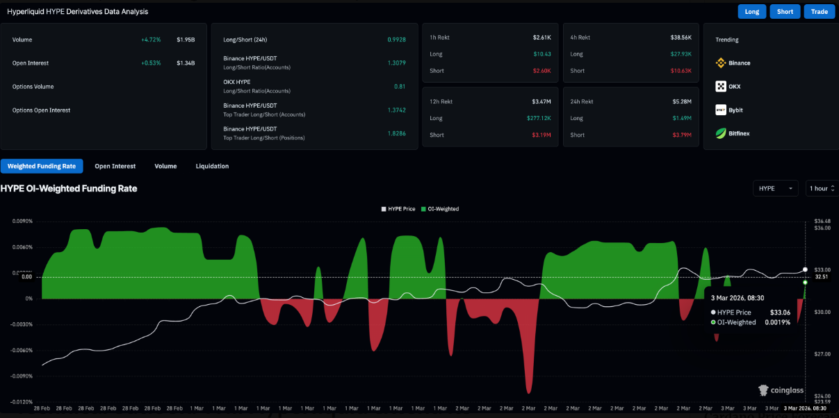 Đáng chú ý, OI hợp đồng tương lai HYPE giữ ở mức 1,34 tỷ USD, tăng thêm 0,53% trong cùng khoảng thời gian. Điều này phản ánh giá trị danh nghĩa của các hợp đồng mở vẫn ở mức cao, cho thấy dòng tiền chưa rút lui mà tiếp tục đặt cược vào kịch bản tăng giá.