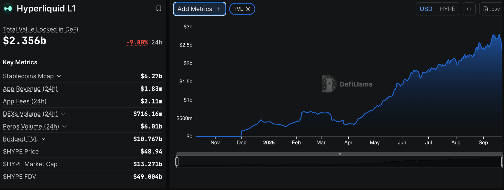 Hiện Hyperliquid có tổng cung tối đa 1 tỷ HYPE, trong đó khoảng 334 triệu token đang lưu thông. Theo DefiLlama, tổng giá trị bị khóa (TVL) của giao thức đạt 2,35 tỷ USD, giảm nhẹ so với mức đỉnh kỷ lục 2,79 tỷ USD.