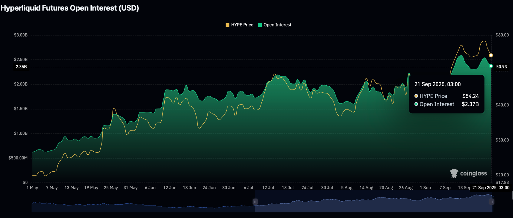 Trong khi đó, số liệu từ CoinGlass phản ánh sự quan tâm của thị trường với Hyperliquid vẫn duy trì ở mức cao, thông qua hợp đồng mở (Open Interest – OI) trên thị trường phái sinh. Cụ thể, OI đạt trung bình 2,35 tỷ USD vào thứ Hai, thấp hơn mức kỷ lục 2,59 tỷ USD hôm 12/9 nhưng vẫn vượt xa con số 1,92 tỷ USD ghi nhận ngày 1/9.