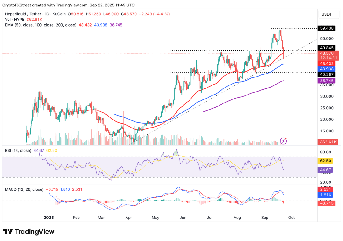 HYPE hiện vẫn trụ vững trên đường trung bình động hàm mũ (EMA) 50 ngày tại $48,43, tương ứng mức giảm khoảng 18% so với đỉnh kỷ lục $59,43.