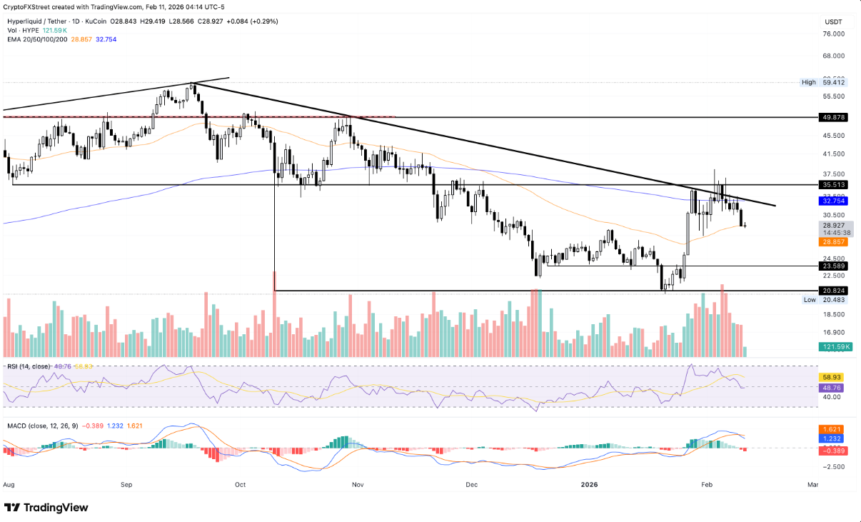 Tại thời điểm viết bài hôm thứ Năm, Hyperliquid đã đánh mất mốc hỗ trợ quan trọng khi trượt xuống dưới đường EMA 50 ngày tại 28,85 USD, ghi nhận mức giảm gần 1% trong phiên. Việc HYPE xuyên thủng đường trung bình động ngắn hạn — trong bối cảnh đường này vẫn nằm dưới EMA 200 ngày tại 32,75 USD — là tín hiệu cho thấy cấu trúc xu hướng đang nghiêng hẳn về phe gấu.