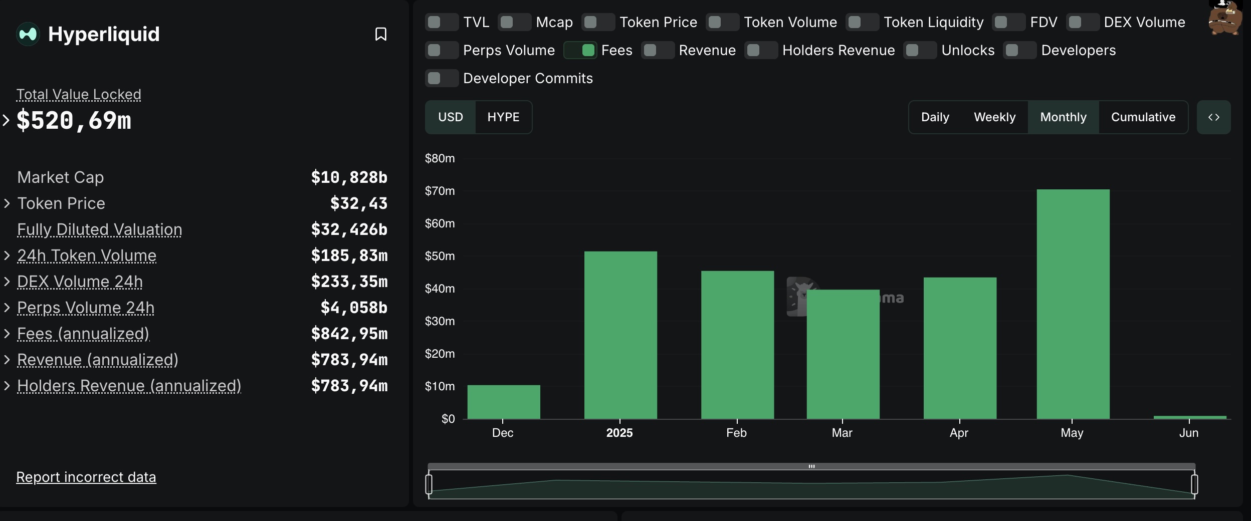 Theo dữ liệu từ DeFiLlama, sàn giao dịch phái sinh phi tập trung Hyperliquid Perp đã ghi nhận khối lượng giao dịch kỷ lục trong tháng 5, đạt 248,3 tỷ USD. Doanh thu từ phí giao dịch và đấu giá mã ticker trong tháng cũng đạt mức cao nhất lịch sử, với 70,45 triệu USD.