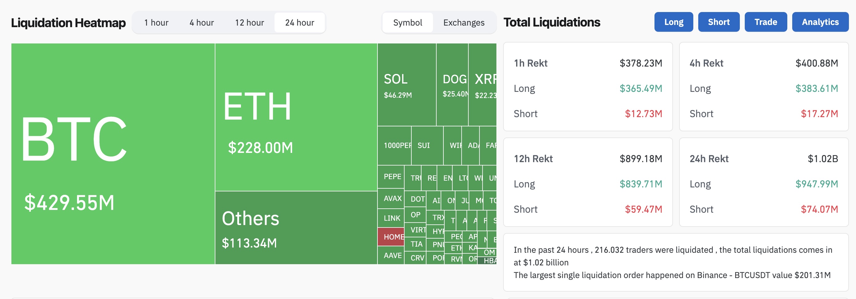 Theo dữ liệu từ CoinGlass, khoảng 215.000 nhà giao dịch đã bị thanh lý trên toàn thị trường trong 24 giờ qua, với tổng giá trị thanh lý lên tới 1,019 tỷ USD. Trong đó, vị thế Long chiếm tới 945 triệu USD. Vụ thanh lý lớn nhất diễn ra trên sàn Binance với cặp BTCUSDT, trị giá 201 triệu USD – con số khổng lồ phản ánh sức ép bán tháo cực mạnh.